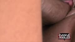 Ela senta no rosto dele, já que está quase nua, porque ela sabe que ele quer ver sua buceta muito perto. A bunda dela é enorme e as mamas dela também.