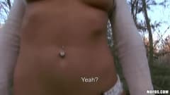 Essa loira tem belos peitos e é fodida na floresta. Ela vai mostrar seu piercing no clitóris