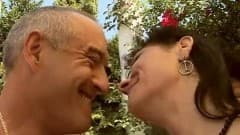 Um casal velho e maduro está no jardim e estão tomando banho nuas ao sol, mas sua pele suada os deixa realmente excitados.