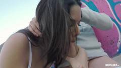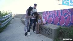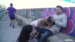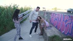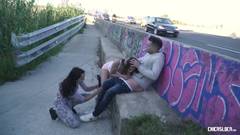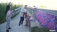 Essas duas garotas não têm problema em chupar o pênis desse garoto na beira da estrada. Eles fazem isso ao ar livre e são gravados para não esquecê-lo.