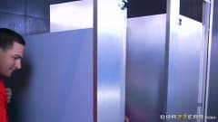 A bela Diamond Foxxx entra no banheiro e faz um bom boquete e um canudo pelo gloryhole com sua boca rica
