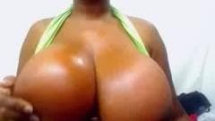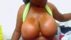 Negra com um par de seios enormes e naturais exibe-os bem perto da camera para deixar você cheio de desejo e a bunda dela também é muito gostosa