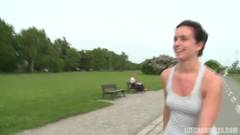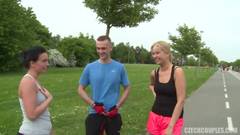 Um casal está se exercitando ao ar livre quando conhece uma garota bonita que os convence a fazer sexo com ela na grama