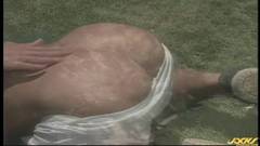 Esse moreno encontra seu vizinho no jardim e toca seu pênis para excitá-lo enquanto beijos apaixonados são dados. Então eles fodem suas bundas!
