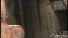 Esses gays estão na cadeia de castigo, e sendo amarrados eles não serão capazes de fazer nada enquanto os outros dois se excitam chupando seus paus.