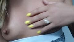 Essa loira mostra seus pés e lambe-os na frente da câmera antes de exportar seu balde raspado para jogar a calça.