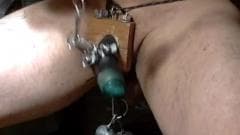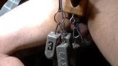 Esta maneira de bater punheta é um pouco estranha. Com vários objetos, fios e pesos, esse cara nu nos mostra como amarrar seu pênis.
