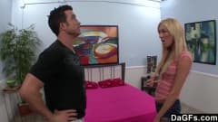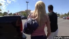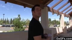Ele dá um folheto para essa loira linda na rua. Depois de uma curta conversa eles vão para o estúdio para treparem e filmarem um pornô sexy!